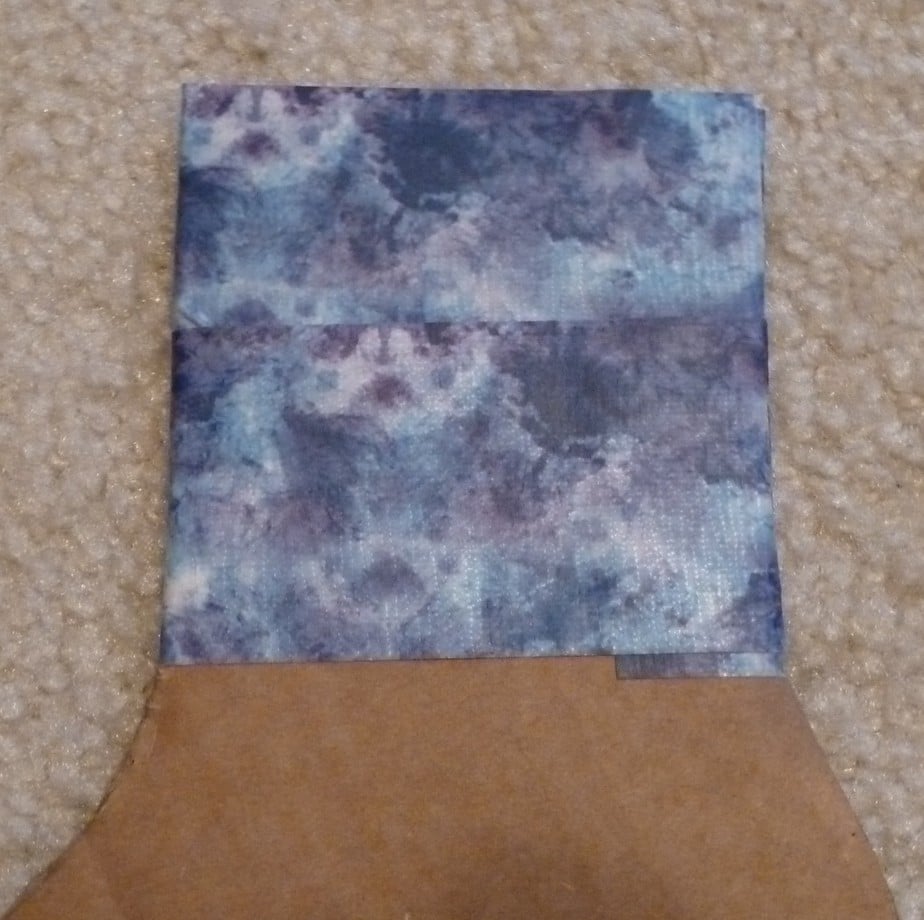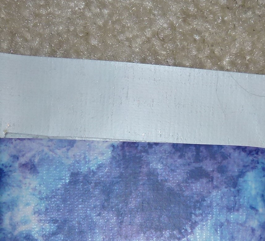 The final step is to seal the “cuff” (top edge of the leg) so it will be waterproof. Cut a piece of tape that is as long as the cuff is wide. Use the full width of the tape for this; do not tear it lengthwise. Lay this piece of tape down, sticky side up. Place the cuff edge of the cutout on top of the piece of tape so it covers about half of the width of the tape.