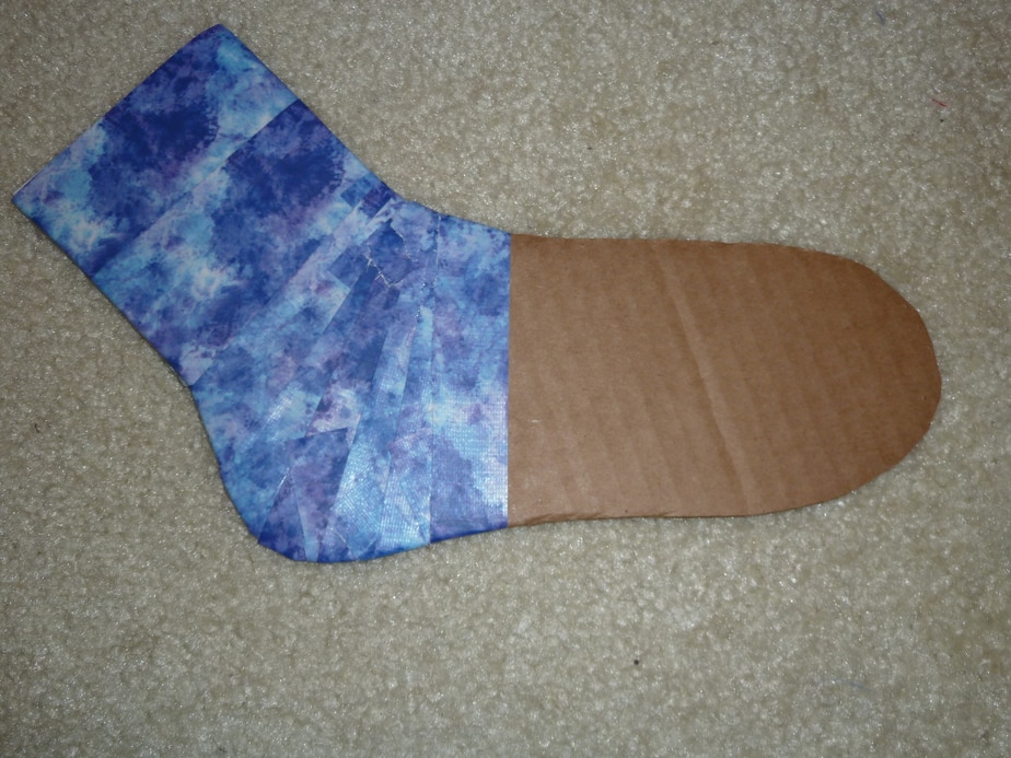 Now we must cover the cardboard sock cutout with Duck Tape. This strengthens the sock blocker and makes it waterproof. Beginning at the “leg” of the sock shape, wrap a few strips of Duck Tape around the cardboard. Each strip of tape should overlap the previous strip slightly, and the ends of each strip should overlap each other. I used two strips of tape around the “leg” of my sock shape, but you may need more or less depending on the length of the “leg” of your sock. Stop adding strips around the leg in this manner when you reach the beginning of the heel.