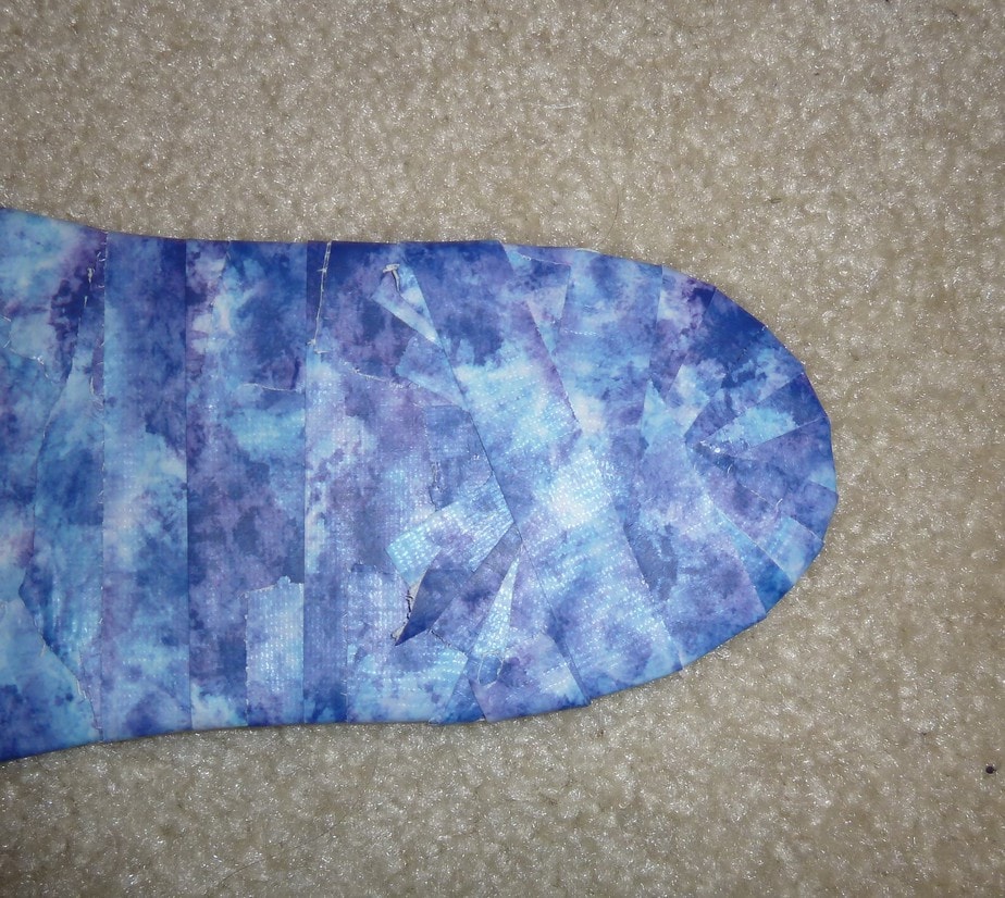 For the toe, we will need quarter-strips. Tear each length of tape in four pieces lengthwise. First, center your strip on the edge of the cardboard, slightly overlapping the previous strip a little. Each end of the strip should overlap the previous vertical strip. Once you have placed your first diagonal toe strip, place another diagonal toe strip to create a mirror image of the first strip. You should have an X on the front and back sides of the toe. This step has been completed twice in the photo below.