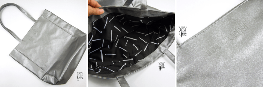 - A huge silver project tote with the cutest crochet-hook print lining,