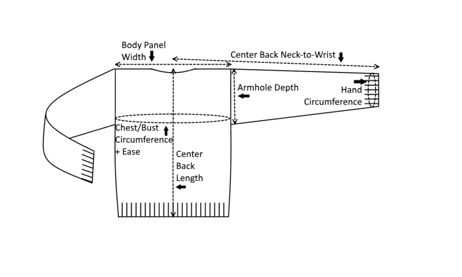 – If seaming several flat panels together to achieve the correct width, decide how many flat panels you need to join to get the correct body panel width. Add 1 stitch on each side of each flat panel for seaming. Divide this number by how many flat panels you want to join for each body panel (front or back). This is the number of stitches you will need to cast on for each flat panel.